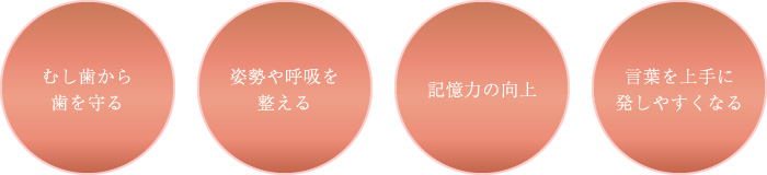 良くない歯並びによって口を閉じることができなかったり、舌の位置が正常ではなくなると、口呼吸や猫背など、呼吸や姿勢にも影響してきます。子どもの頃からきちんと観察して歯並びを管理すれば、お子さまのより健全な成長へとつながります。また噛み合わせや歯並びを改善すると、唇や舌の動きがよくなり、発音が改善されることもあります。また良い噛み合わせでしっかり噛むことができれば、脳の活動が活発になり、記憶力が向上するなどの効果もあります。(脳の咀嚼に関わる部分のすぐ近くに記憶に関わる領域があり、刺激を受けて活発になるため。)